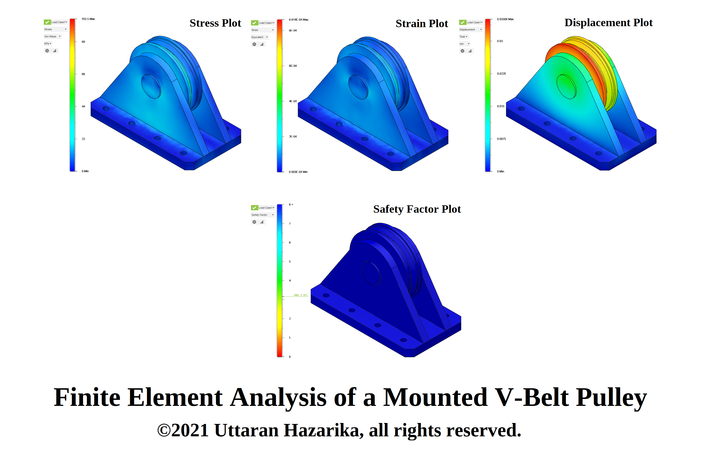 FEA Mechanical Engineering Finite Element Analysis of a Mounted V-Belt Pulley by Uttaran Hazarika April 27, 2021April 27, 2021 Finite element analysis of a mounted “V-Belt Pulley” done in Autodesk Fusion 360. Post navigation Finite Element Analysis of a Mounted Triple Rope PulleyFinite Element Analysis of a Ball Grip Positioning Arm